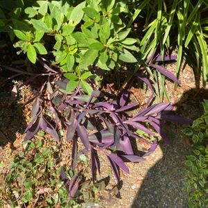 なんていう名前でしょうか? よく見かけるムラサキの花。濃い紫色の葉がV字開脚みたいに両側に開いて中に小さい花が咲く。低くワサワサ咲いてます。💜 → 紫大露草、別名 紫御殿 と教えていただきました! ありがとうございました。💜