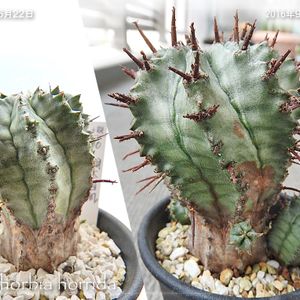 付いていた札は「胴太白肌ホリダ」。多肉を初めて半年目くらいのころ、オベサ・バリダ・ホリダをそろえたくて探してやっと見つけたもの。とにかくホリダ! の気分だったので、見かけは二の次でした。後になって、白肌というほど白くないし、棘も少ないし、形もいまいち、と思ってちょっとほったらかし気味だったんですが、こうやって比べてみると大きくなったし棘も増えたし、ごつくなった! 棘って先端からしか出ないと思っていたけど(ほかのホリダは先端からしか出ない)、このホリダは下の方からも新しく棘が出てきました。子株も増えたし、この頭でっかちぶりは比べてびっくりです。