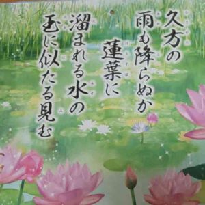 万葉集 令和 2年 7月の うた 7月 ( 文月 )の草花 : 蓮 ( は す ) 作 : 作者 未 詳 読み : ひさかたの あめも ふらぬか はちすば に たまれる みずの たまに にたる みむ 訳 : 雨も 降ってくれ ないかなあ 蓮の葉に、溜まっている 水が 美しい玉に 似ている のを 見よう 。 解説 : この歌には注が有り、それによれば、 これは歌の上手な警護の役人の作 。 役所で 宴席を設けた際、食物を蓮の葉に盛った 。 余興の歌や 舞が出る中、 『 蓮の葉 』に関連した歌を詠めと 言われて、 直ぐに作った歌だという 。 他にも 椎など 大きな葉は、皿 代わりに 使った 。 仏教伝来の後、蓮は極楽の池を連想させ、 濁った池に 生えるが 、 葉には 清らかな 玉を 結ぶなどと 詠むまれる 。 この時代は まだ、 仏教との 結びつきは 薄い 。