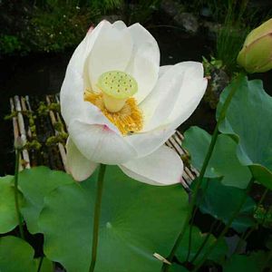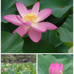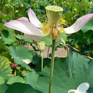 池にハス(蓮)の花が咲いています。 周りにはもう終わった花もあります🌼 シャワーの出口みたいなハスの種が見えています😃