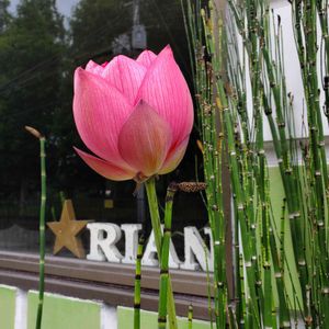 蓮の花開花一日目 お店の入り口に咲いた花には、昆虫よりも人間の方が引き寄せられ、強烈に香る一日目の芳香に、お客様皆鼻を突っ込んで匂いを楽しんでいました😄 ああ、ちゃんと植え替えしていれば、もっと蕾が上がったのに! 来年は絶対に頑張ります❗
