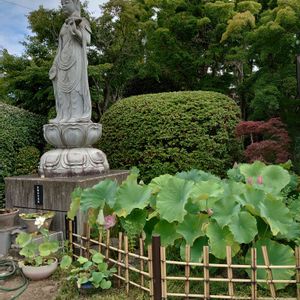 観音様の隣りに蓮の花。 茨城県龍ケ崎市・龍泉寺にて。