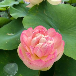 蓮池に八重咲きのピンク色の蓮の花が咲いています。