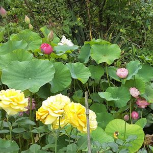 蓮池に八重咲きのいろんな蓮の花が咲いています。 ご近所さん達が蕾の段階で切り花にして持ち帰るので残りの分がやっと開花しています。 手前には黄色の薔薇が咲いています。
