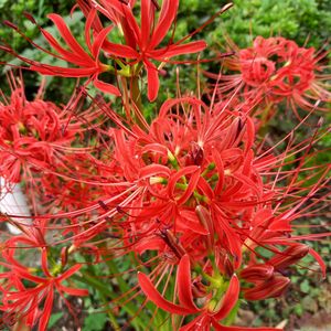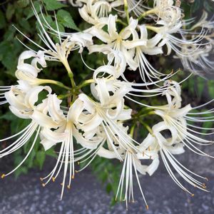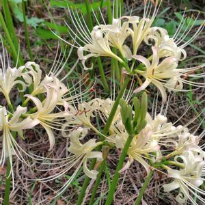 白い彼岸花 ヒガンバナ科ヒガンバナ属 多年草 中国大陸原産 北海道〜南西諸島 土手、堤防、畔、道端、線路脇などで、人手の入っている所に生育する。 通常は日本在来の赤色種のヒガンバナだが、まれに色素形成以上で白みがかった個体が見られるが、これは除草剤の影響であると最近は考えているらしい。 それと、シロバナマンジュシャゲと言われるものもある。 これはヒガンバナの白花種ではなく、暖地に見られるショウキズイセンとヒガンバナの雑種である。 庭園や観光名所に植栽もされる。