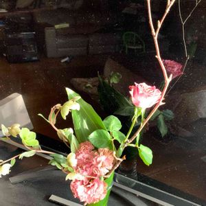 先月のアレンジ教室の花は、トルコキキョウ、薔薇、クリスマスローズ、カーネーション、 メギの新芽。ハランでオアシスを包みガラスの花器に❣️お花の色がすべて深いアプリコットで統一されていて うっとり💕