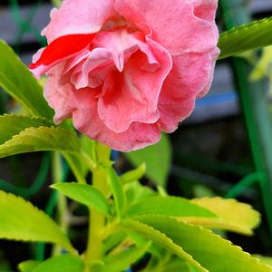 今日のお花、らしいので1枚パチリ 種から育てた八重咲きホウセンカです😀 めっちゃ雨降ってるーー!
