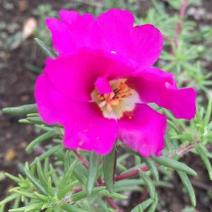 このビビットなピンク色のお花は何でしょうか⁇ ‥皆さんのおかげで「マツバボタン」だと判明しました‼️ありがとうございます😊 庭に生えてきたのですが、変わった葉っぱだったので抜かないでおいたらビビットなお花が咲いたのでビックリしました👀 抜かなくて良かったです😅
