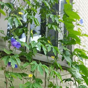 子蔓、孫蔓がもっと伸びることを期待… 朝顔は、見事に全て青。