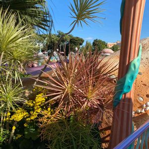 朝9時 カリブの海賊の近くの植物鉢植えが沢山あり綺麗でした🌺🌿 土も水やり後の様子で綺麗に管理されてました🏵