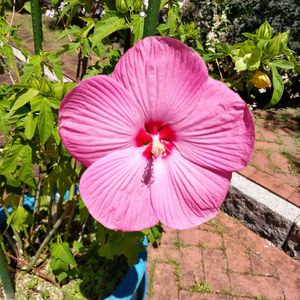 真夏の太陽の様な タイタンビカス バルカン 大きな花には、時折りカエル🐸も飛び乗ります😅