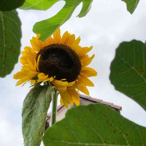 やっと開花しました。 去年採取した種が発芽したものの、長雨、酷暑で成長が今一つでした。2メートル以上のヒョロヒョロだけど、空に向かって咲いています。