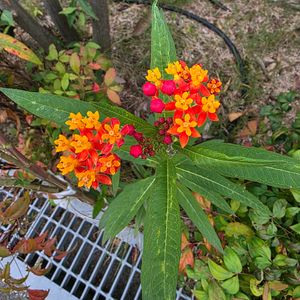 この花、何かしら❓ でGoogleさんから、アスクレピアスと 熱帯アメリカ原産の耐寒性多年草 キョウチクトウ科 トウワタ属 別名 トウワタ(唐綿) オオトウワタ ヤナギトウワタ スカートを広げたお人形さんが並んでるみたいな ちよっと変わった可愛い花🧡 茎を傷つけると切り口から白い液が出ます この汁はアルカロイドを含み、強い毒性を持つ 触らない、撮るだけですねぇ 🏷ビタミンカラー