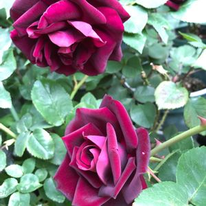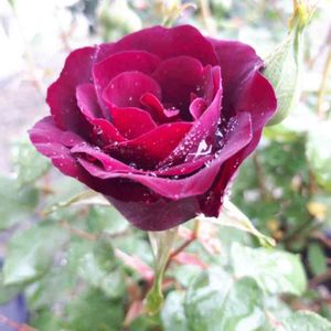 ルイ14世 バラのつぼみが膨らんできましたね♡ 最初に開いたのは、深いワイン色の黒バラです。 冷たい雨の中ですが、頑張って咲いています♥️