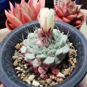 こんばんは😊 今日はとてもいいお天気☀️☀️☀️ しっかりみんなに降り注いでくれました。 この先また雨になりそうで、水遣りを少し控えなくちゃ🍃🌿🍀☘🚿🚿🚿 三河サボテン園よりお迎えした2つ目。 ストロンボカクタス 菊水 実生❣️ 小さな花のようなトゲも、とんがり帽子のようなトゲも、わたわたの刺座も、それはもう可愛くて可愛くて≧ᴥ≦♡*. ゚