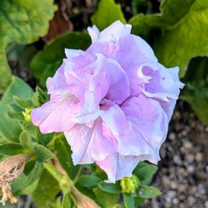 今朝のお散歩…散歩後ベランダより ①八重咲きペチュニア ②ルリマツリ ③ダンドク ④ポンポン咲き♪ジニア ⑤うちのマツバボタン💕 株分け中ですが、また咲いてくれました。