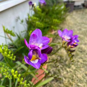 フリージアも開き出し💜💚 たくさんの蕾を付けて開花を待ってます🎶 香りも楽しめるので大好きな球根植物💕