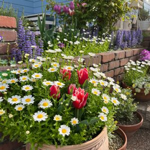 玄関前に毎年零れ種から芽🌱を出し庭を賑やかにしてもらってるノースポール🌿🌼🌷 鉢の寄せ植えにも今年はチューリップ🌷の赤白フリンジ付き もう少し背丈が高くなってくれると良かったなーノースポールの威勢に負けてる😅