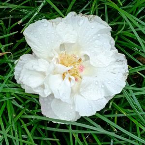 酔芙蓉 落花 今日は雨☔ 肌寒い朝です リュウノヒゲを枕にぽとり…🙂↕️
