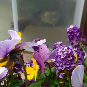 こんにちは🌸 ビオラとアリッサムの奥に くさ亀がこちらを覗いています 沢山洗濯したのに お天気はいまひとつ☁️