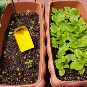 サンチュは元気に成長中 パクチーは結局6本しか芽は出ず⤵ 土の周りに小さい虫がもやもや飛んでるので、駆除シートを設置しました。