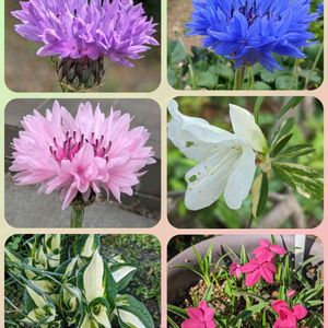 ヤグルマギク3色と、一枝だけ斑入りのツツジ、斑入りギボウシ、アッツ桜です 🌿🥰