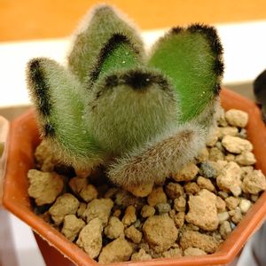 今日ジョイフルで出会った不思議な子٩(◕ั ˑ ◕ั๑) 葉の形は熊童子☆ でも熊ちゃんの爪は無くて...(͒⑅′࿉‵⑅)͒ෆ* 葉の色モコモコ感は月兎耳の感じ☆ まるで、熊童子と月兎耳のハーフみたいなこの子、ご存知の方いらっしゃいますか?
