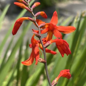「ヒメヒオウギズイセン(姫檜扇水仙)」 別名 クロコスミア、モントブレチア ヨーロッパで交配されて作られた園芸植物で明治の中期に観賞用に渡来。 野生化した群落も見られる。 漏斗形の花は先が6つに裂け平らに開いて下から咲き上がっている。 朱赤色がよく目立つ✨💕 関東以西に分布(帰化植物)
