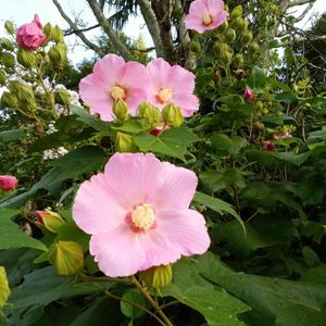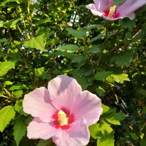木槿、背が高いです。 首がくたびれる… でも、空がキレイなのが分かりました😃 この花も一日花🌸…かと思ったら、2日咲くのもあるとか💮