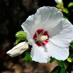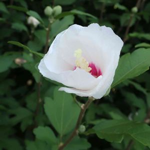 白い木槿✨ 蕾は薄い和紙をクシャクシャにした感じ😃 夏の庭に1本欲しい木です😍 冬の間は、棒みたいな面白味のない木かな(個人の感想で~す)
