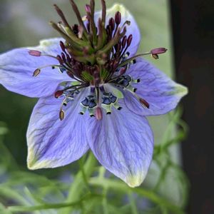 ニゲラに種類があるなんて⑅◡̈* 知らなかった。。。。 種から育ててると、葉も違うし、茎も少し太くて、枝がたくさん出てきて、ちょっと逞しい感じのニゲラさん🎶 蕾も細かなラインが入っていて、ちょっと重そうなアタマって感じで♪ 咲いてみたら濃いブルーという少し紫がかってる艶のある花びらに見えるガク💙 この色も美しい⑅◡̈* おしべ、めしべ、蜜腺鱗片とのコントラストが、個性的な姿(๑ˇεˇ๑ 種が入った時の姿まで楽しめるニゲラ✿︎ この子はどんな姿に変身するのだろう?! 花芽がたくさんついてるので、それも楽しみにしつつ、長く咲いて欲しいなぁ💕