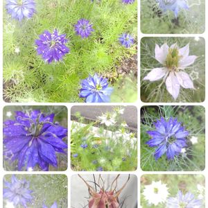 🗾🌁豪雨🌁☀️猛暑☀️ 📺️ニュースで見る豪雨の映像にビックリしてます💦 モコ地方は猛暑です🥵 夕方の🚿水やりも手抜きしたい気分ですが…昨年収穫した種🌱種蒔きニゲラが今花盛り💙🤍💙 涼しげな葉っぱとお花~😌✌️ ⇩コンクリートの隙間で育ってるこぼれ種ニゲラは🎈状態になって中には∴種が~来年用に種取りしま~す🙌