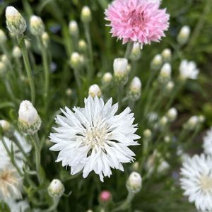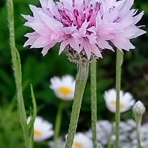 今日のお花 ヤグルマギク 矢車草 白とピンク、あと青も一株ずつですがどれも大きくなり、倒れながらも咲いています