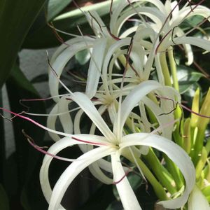 ハマユウ(浜木綿) 別名:ハマオモト ヒガンバナ科 ハマオモト属 6/21にpicしましたツボミに花が開きました 花の様子はコウゾなどの樹皮を細長く裂いて作った繊維から作った布と似ており、神道神事で用いられる白い布をゆうと呼ぶ 別名のハマオモトは肉厚で長い葉がオモトに似ている事からだそうです