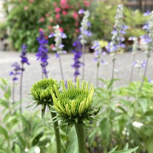 金曜日の蕾たち参加いたします🏷️ ①エキナセアの白い蕾🤍 咲かのが待ち遠しい バックのお花は ブルーサルビアサーリファン🩵 ブルーサルビアファリナセア💜 ②ワインカラーのスカシユリ ③ピンクのペルマム🩷 もっと奥のお花つるバラはお向かいさんのです 貰って何度挿し木しても私に懐いてくれないバラ🌹