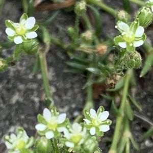 ネバリノミノツヅリ(粘り蚤の綴り) 💠✨ 道端シリーズ🌱✨(海沿い)です 「蚤が着る粗末な着物」という、 何だかよく分からない残念な名前をつけられてますが😅、 ハコベ や ミミナグサ ほどの大きさの、白い小さな カワイイ花です 💠花弁は裂けず、5枚 🌱花びらの間から萼片が覗く 🌿茎はよく分岐して広がるので、 集散花序ということもあって、 全体に 花が散らばって見えて可愛いです(*´ω`*)💕 🌱葉っぱは、絵に書いたように対生してます 最初、 普通の「ノミノツヅリ💠」だと思ったのですが、 変種の「ネバリノミノツヅリ💠」もあるとのこと💧 ☝️違いは…… 「ネバリノミノツヅリ💠」には、 全体に、 短い毛とは別に、「腺毛」があることだそう…… ✳️「腺毛」とは……分泌物を出す毛のことで、先端が丸くなってることが多い う~ん😓 毛先にプツンとした玉がついてる毛があるような……❔ そこまで鮮明に撮りきれてないのですが💦、 >『海岸沿いや護岸、または道路脇の乾燥した場所に生えていた』 という観察コメントを参考に、 今回は「ネバリノミノツヅリ💠」としました😌 (普通の「ノミノツヅリ💠」かもです💧) ちなみに、 これが生えていたのは、 堤防と道路の際でした😌