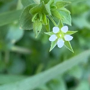 仕事帰りにハコベかなって見てみたらちょっと違うみたいです Googleさんはノミノツヅリと教えてくれました。 全体に腺毛があるものを変種のネバリノミノツヅリ(粘り蚤の綴り)というらしいです。 3ミリ位の白いお花が意外と可愛いかったです🤍 他の雑草に比べて草丈が低く、小さな葉が「ノミの着物」に例えられたのが名前の由来だそうです 花期:3〜6月