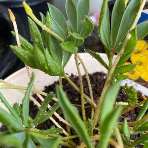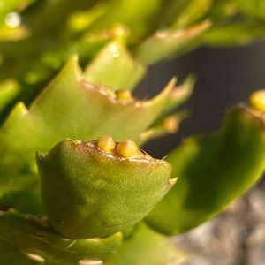 朝、郵便受けから📰を取り出し下を見ると マンネングサの葉のつけねの辺りに 花の様なものが! いったいこれはなんでしょう? 御存じの方、教えてください😃