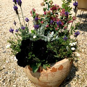 寄せ植え、オレガノ、ラベンダー、アレナリア、雪柳と、黒いペチュニアをメインにしました❣️オレガノケントビューティーグリーンと思ってたらピンクなんですね💕