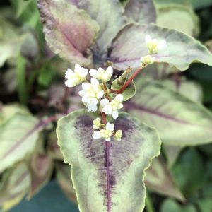 こんにちは☀️ 水撒き時🚿発見🫢 斑入り葉ワイルドストロベリー実ってました🍓 後、米粒みたいなペルシカリア 溢れ種からジュズサンゴ花壇の中あちこちに〜白いお花が開花🤍✳︎