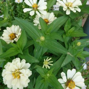 ジニア(百日草)一鉢に三色のお花、白、黄色、ピンク~✨可愛らしく咲いています🎵💗💞💕💛💫