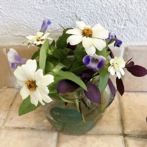 玄関先の花を摘んで、ガラスのコップにいけてみた ふわふわのケイトウがアクセント