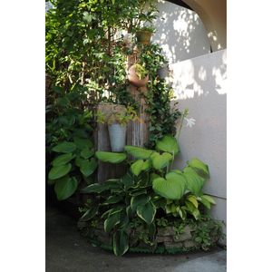 ◆いつもの箱庭 先週枕木周りをギボウシに変えてみたものの、余り気に入らなかったので再度変えてみました。 高さに変化を付けたくて、銅葉のミレットパープルマジェスティを置いてみようかと思ったのですが、ここにミレットを持ってくると、花の入れ換えをしたメインの花壇のアクセントが無くなってしまうので、他に何か良いものは無いかと、代役になる役者を探してみると、目に止まったのが花が咲き始めたライムグリーンのギボウシ!! ギボウシと言っても、それなりに草丈もあり そこから伸びた花も悪くないので、一番後ろのギボウシをライムグリーンのギボウシに変えて、小さなギボウシを大き目のギボウシに変えてみました。 これで少しは高さに変化ついたかな...?!