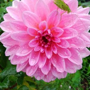 朝から しっとり雨です☔ 庭に出たら ダリアにお客さま 思わずスマホをトリに 花言葉 華麗 優雅 気品 移り気