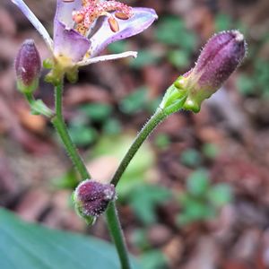 【ヤマジノホトトギス(山路の杜鵑)】 日本原産、ユリ科ホトトギス属多年草 北海道から九州まで広く分布し、山野の林内に生育する。 茎先や茎の上部の葉腋に1~2個、上向きに花をつける。 花は杯状の6弁花で、花被片は平開して、白地に紫色の斑点が入る。 雌しべの花柱は3つに分かれて、それぞれがさらに2裂して平らに開く。 雄しべは6個あり、花糸は花柱に沿って立ち上がって上部で反り返り、外向きに葯をつける。花糸と花柱には斑点がない。 ヤマホトトギスの花とよく似ているが、ヤマホトトギスの花被片は下向きに強く反り返り、花柱や花糸にも斑点が付く。 草丈:30〜60cm 花期:8〜10月 花色:紫、白 山野草のエキ@周南市