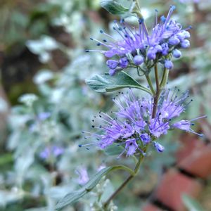 今日のお花の仲間。 カリオプテリス スターリング シルバー💦ながっ❗💦 去年は瀕死状態でしたが、今年は咲きだしました✌️ シルバーの葉っぱにパポーのお花、、鉄板のカラーコーディネート😉 今日は、名残の夏日かな、、、