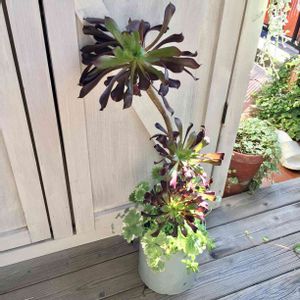 ペイントしたペンキ缶に植え込んだ黒法師です。 気がついたら、グレコマやディコンドラ、謎の多肉が勝手に根元で増えていました😅