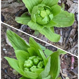 裏庭のフキノトウです🌱 蕾が見えてきました♪ 上が雌株で下が雄株かな? ちょうど食べ頃ですが これは食べないで観察します🎶