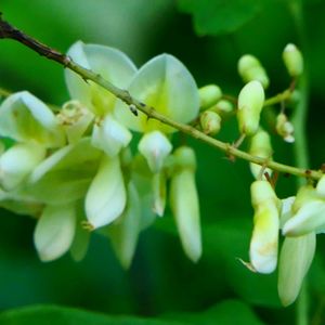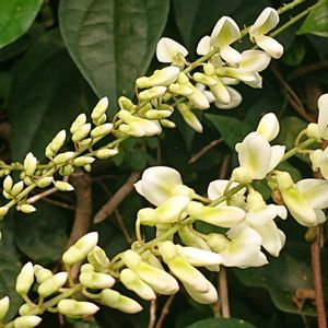 ほぼ緑色ばかりの道路脇に、白い美しい花を見せてくれるナツフジ♡ 清らかな純白にしばし見惚れて〜 まだまだ蕾がたくさんありますが、すでに咲き終わった花序もあり、少しずつ順番に開花するようで、一気に満開!という状態にはならないみたいです 一斉に咲いたら見事なのにねぇ🥹