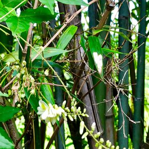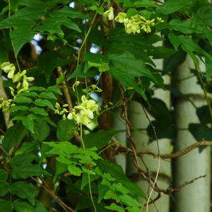南天の木に、絡まって咲いてます。蔓で白い藤の花にそっくりです。